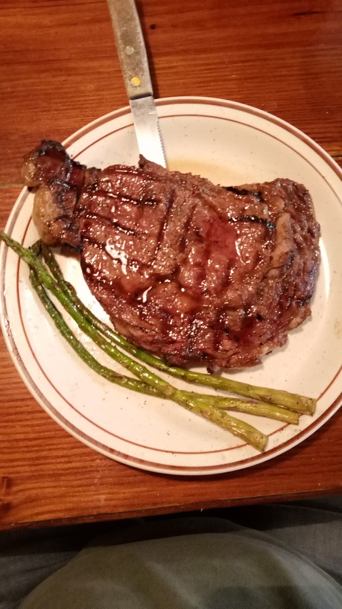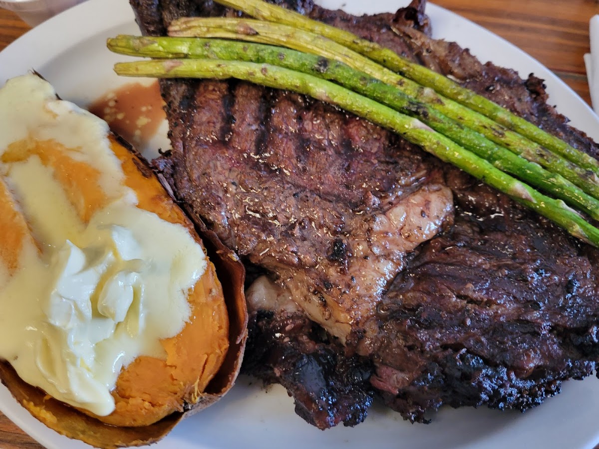 Steak&Shrimp Combo Sirloin Steak and Deep Fried Shrimp and Potatoe Wedges and a Side of Asparagus